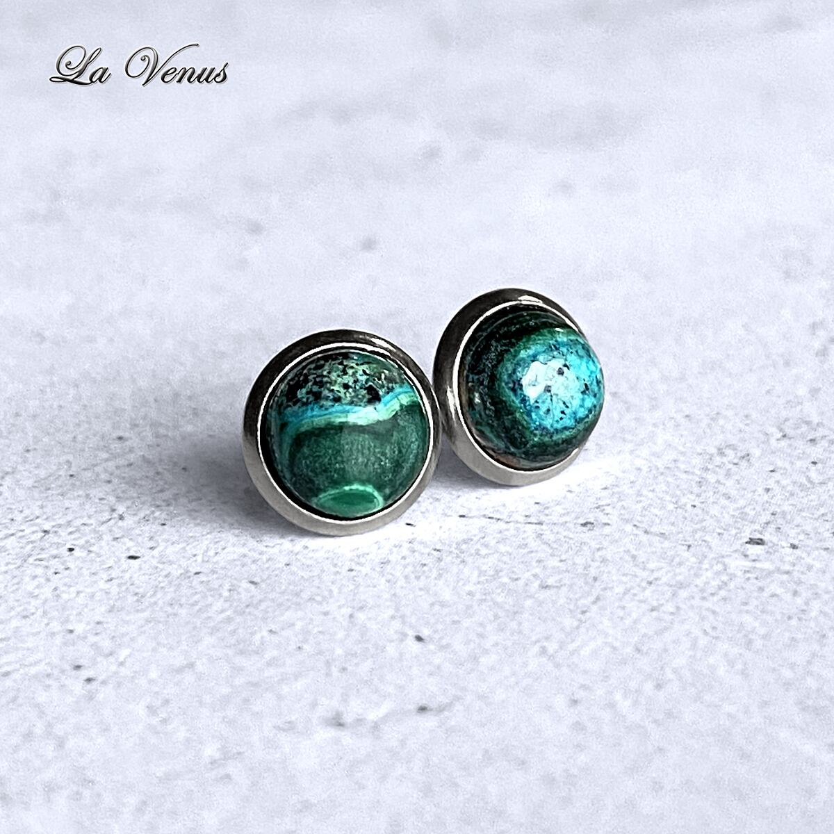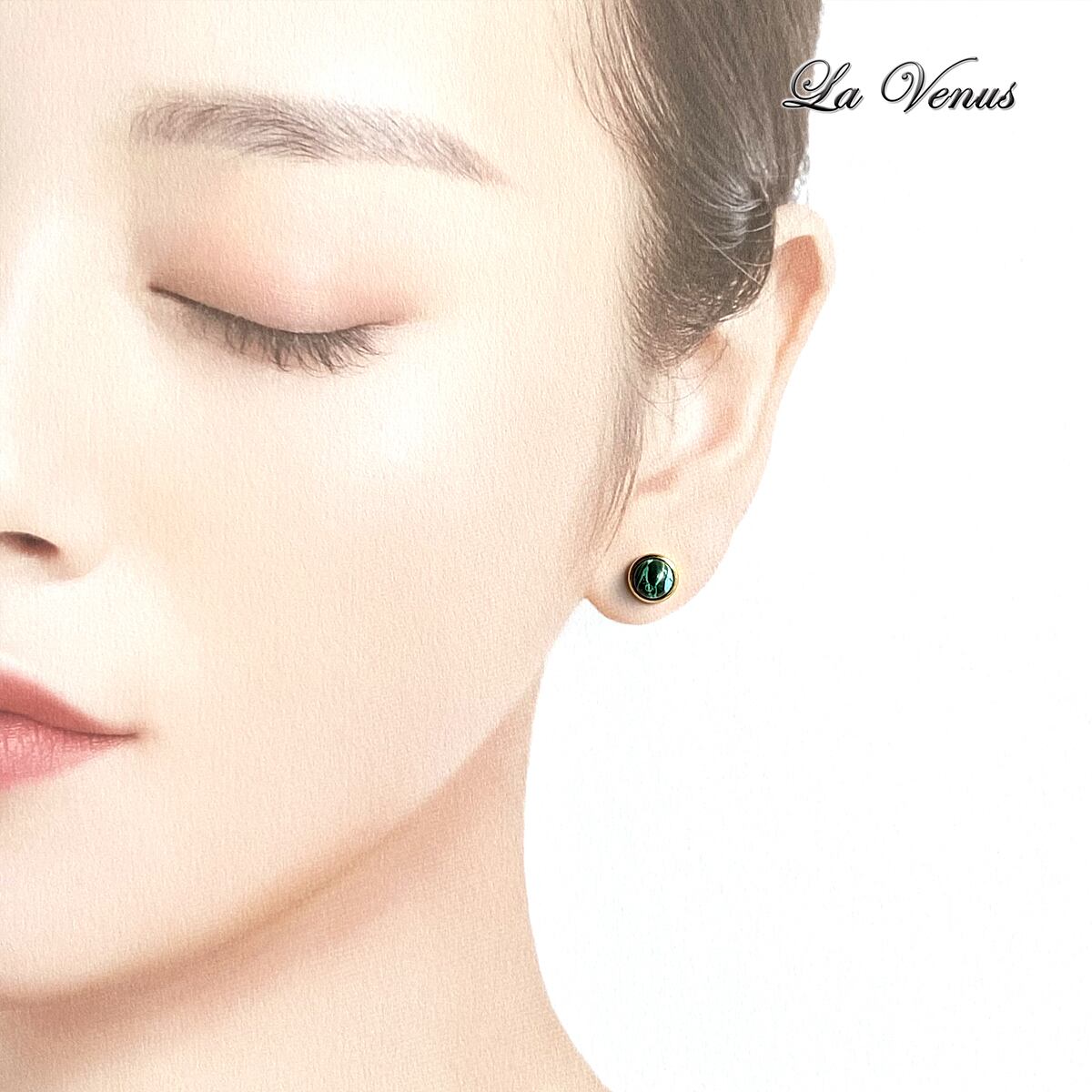 ✴︎希少石✴︎ つけっぱなしOK アフリカ産 クリソコラマラカイト ベゼルピアス 大粒6mm SUS316 サージカルステンレス 台座 片耳用 金属アレルギー対策 覆輪 ゴールド シルバー