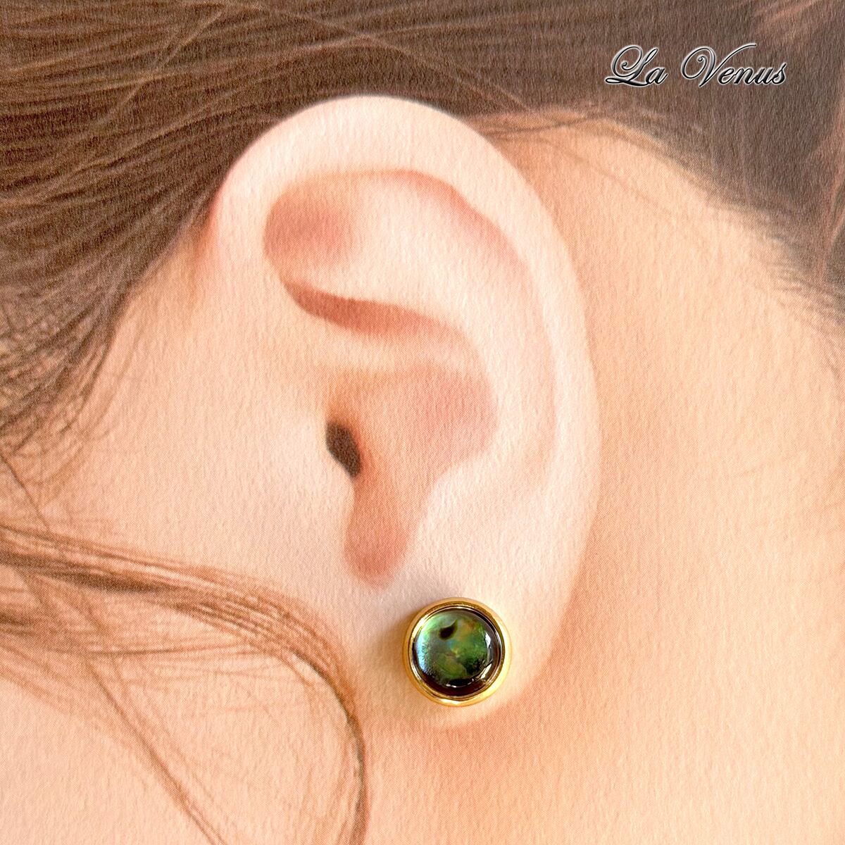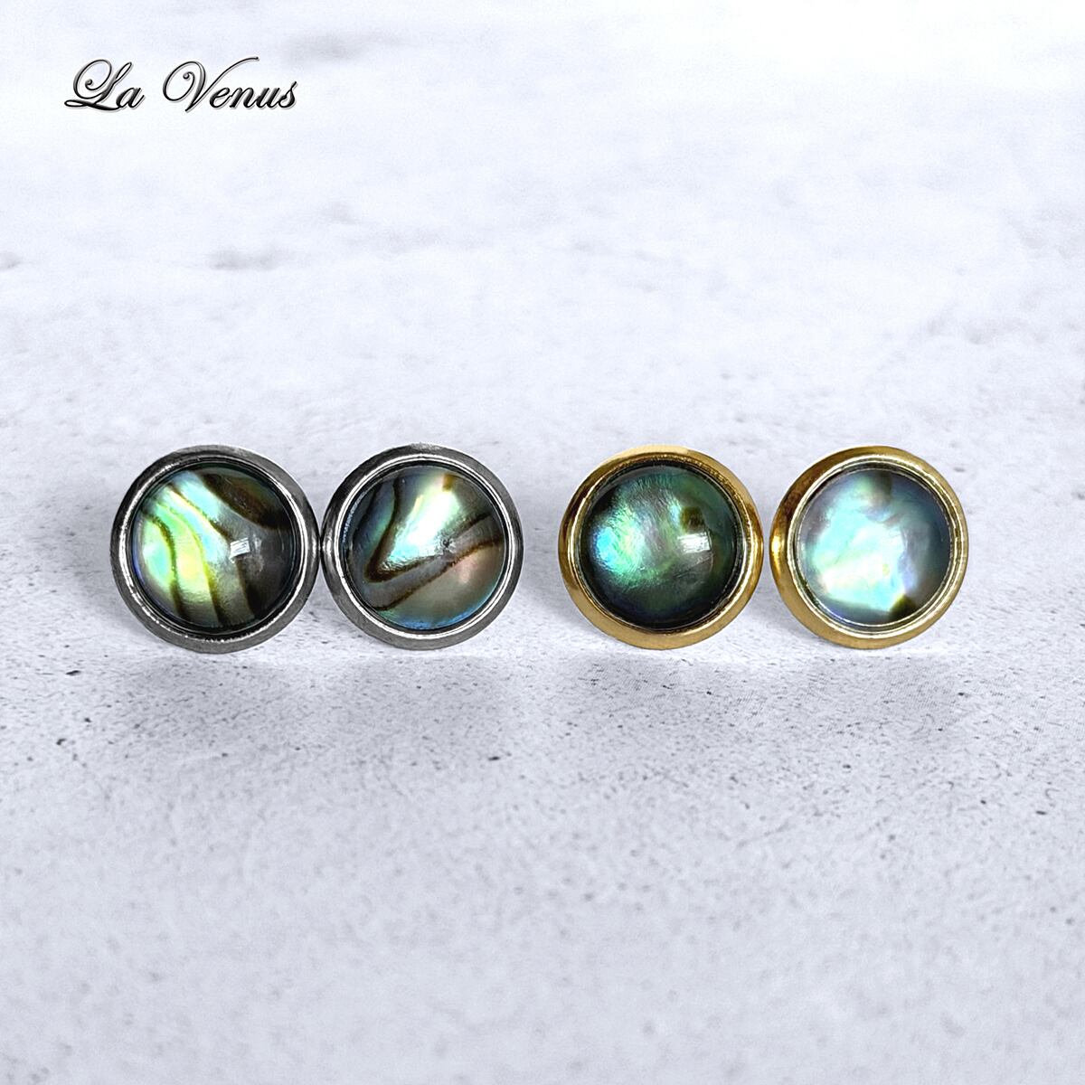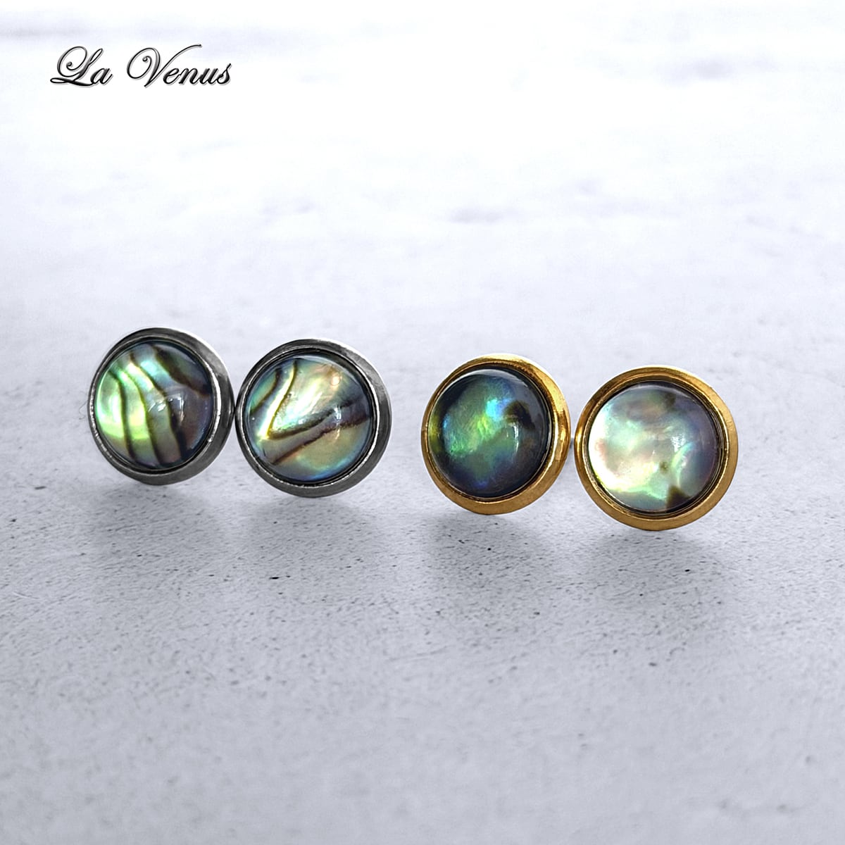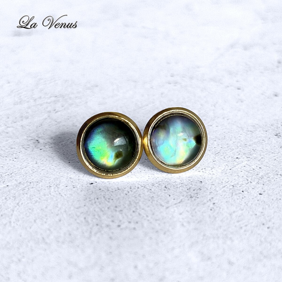 ✴︎海のオーロラ✴︎ つけっぱなしOK 天然 アバロンシェル × クリスタル 天然水晶 ベゼルピアス 大粒8mm 316 サージカルステンレス 両耳用 金属アレルギー対策 覆輪 ゴールド シルバー