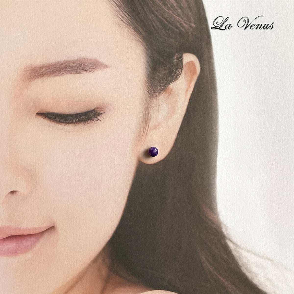 ・紫が肌の透明感を引き立て、柔らかい陰影と知的さをプラス。
